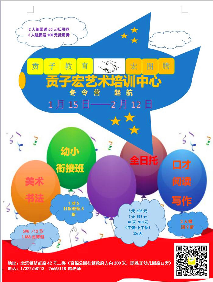 贡子宏是由广东贡子教育管理有限公司和深圳宏图腾少儿教育机构联合创办的,贡子宏艺术培训中心集文化、艺术、智力口才为一体的教育机构,起步就与世界同步。寒假(2017年1月15日—2月12日期间)开设有托管班、书法班、美术班、幼小衔接班、口才阅读写作班。让孩子的寒假生活更丰富多彩,养成良好的生活和学习习惯,与艺术做朋友学会同学朋友间的沟通交流,远离网络世界。