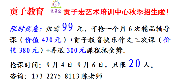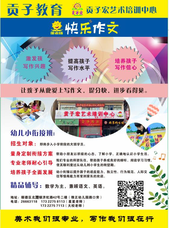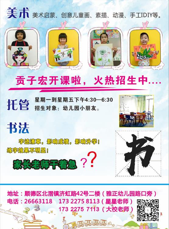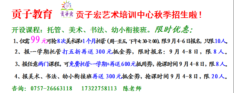 贡子宏艺术培训中心是贡子教育旗下艺术培训品牌,目前开设课程有:美术、书法、快乐作文、幼小衔接、精品辅导、托管等。总部位于佛山市顺德区北滘镇济虹路42号2楼,现正限时优惠、限额限量火热招生,有需要的家长请予关注,联系:173 2275 8113(陈老师) 173 2275 7113(韦老师)。优惠活动至9月6日截止,9月7日全面开课。
