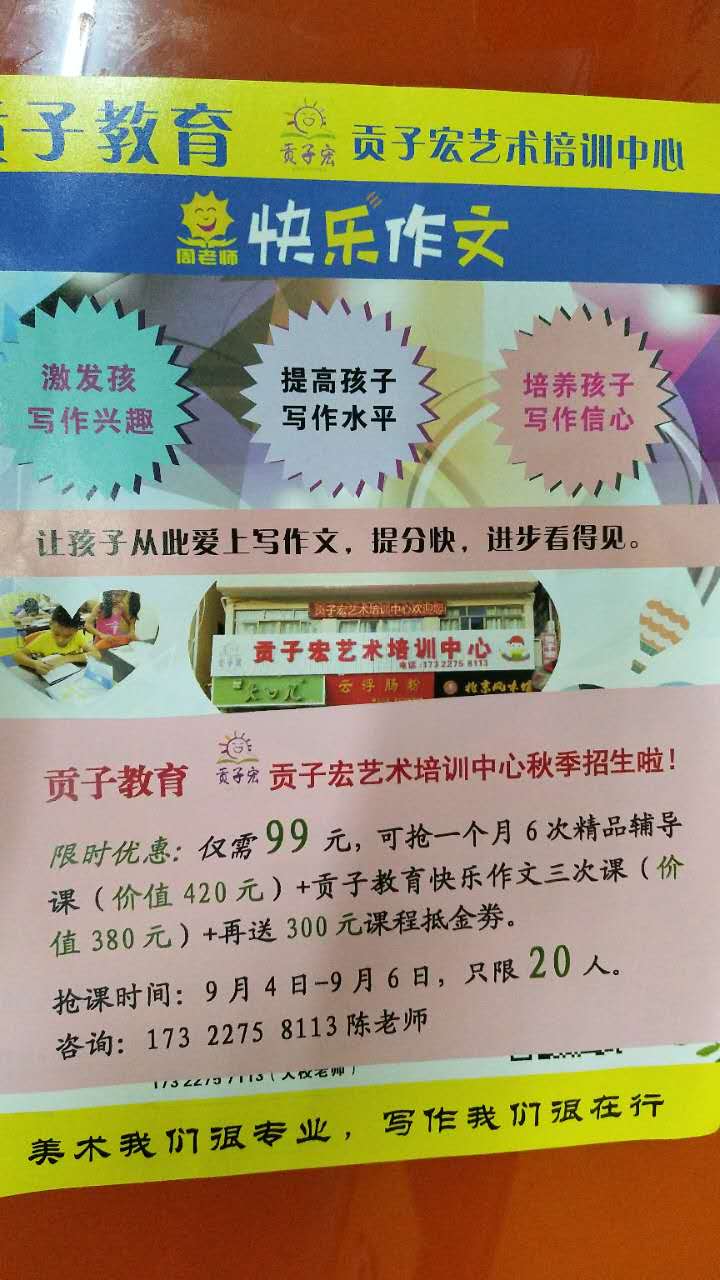 秋季开设课程: 美术(儿童画、创意画、动漫、国画) 、书法、幼小衔接、阅读与写作、精品辅导、托管等,9月8日之前报名有优惠活动,还可砸金蛋,小朋友们快来报名吧!