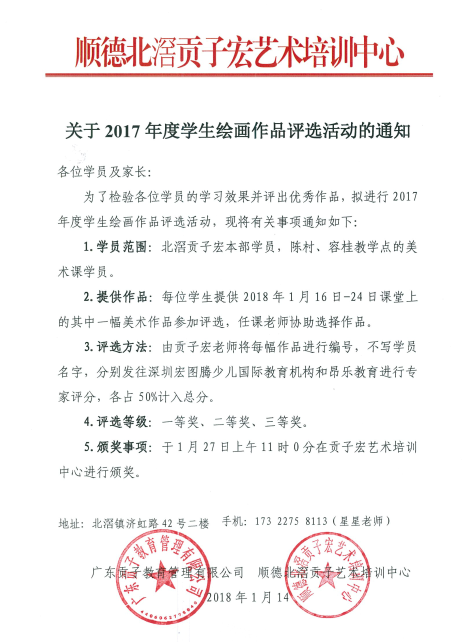 贡子宏艺术培训中心拟举办2017年年度学生绘画作品评选活动,请各位任教老师、学生及家长踊跃报名参加,作品将由贡子教育、深圳宏图腾国际少儿教育机构、昂乐教育上百名老师进行评选打分。