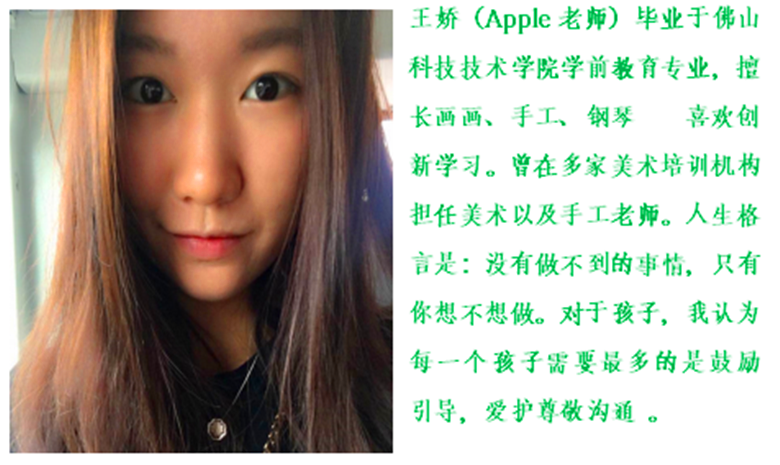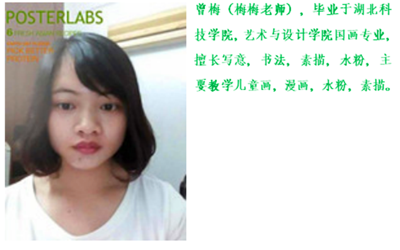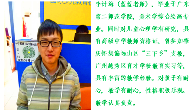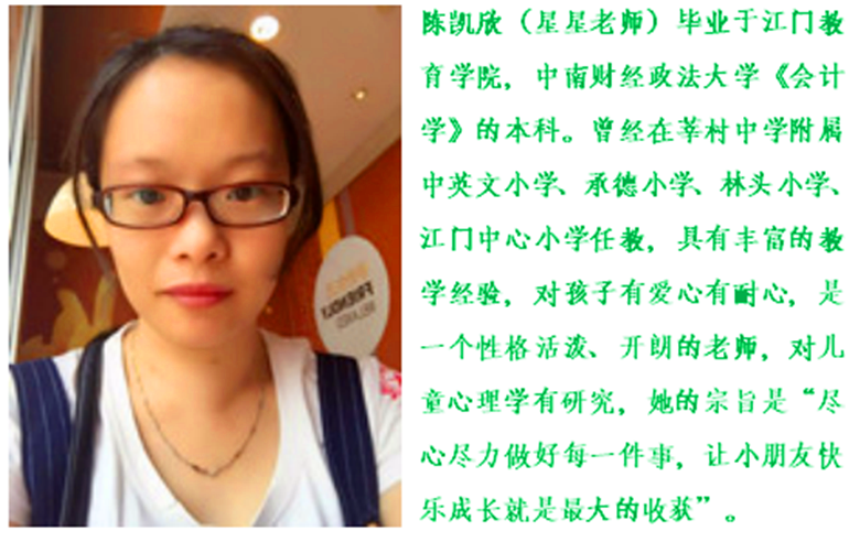 蒙锐晶(蒙蒙老师)毕业于江门职业技术学院,美术教育专业,曾在江门甘光学校任教。性格开朗,待人热情,教学有耐心。